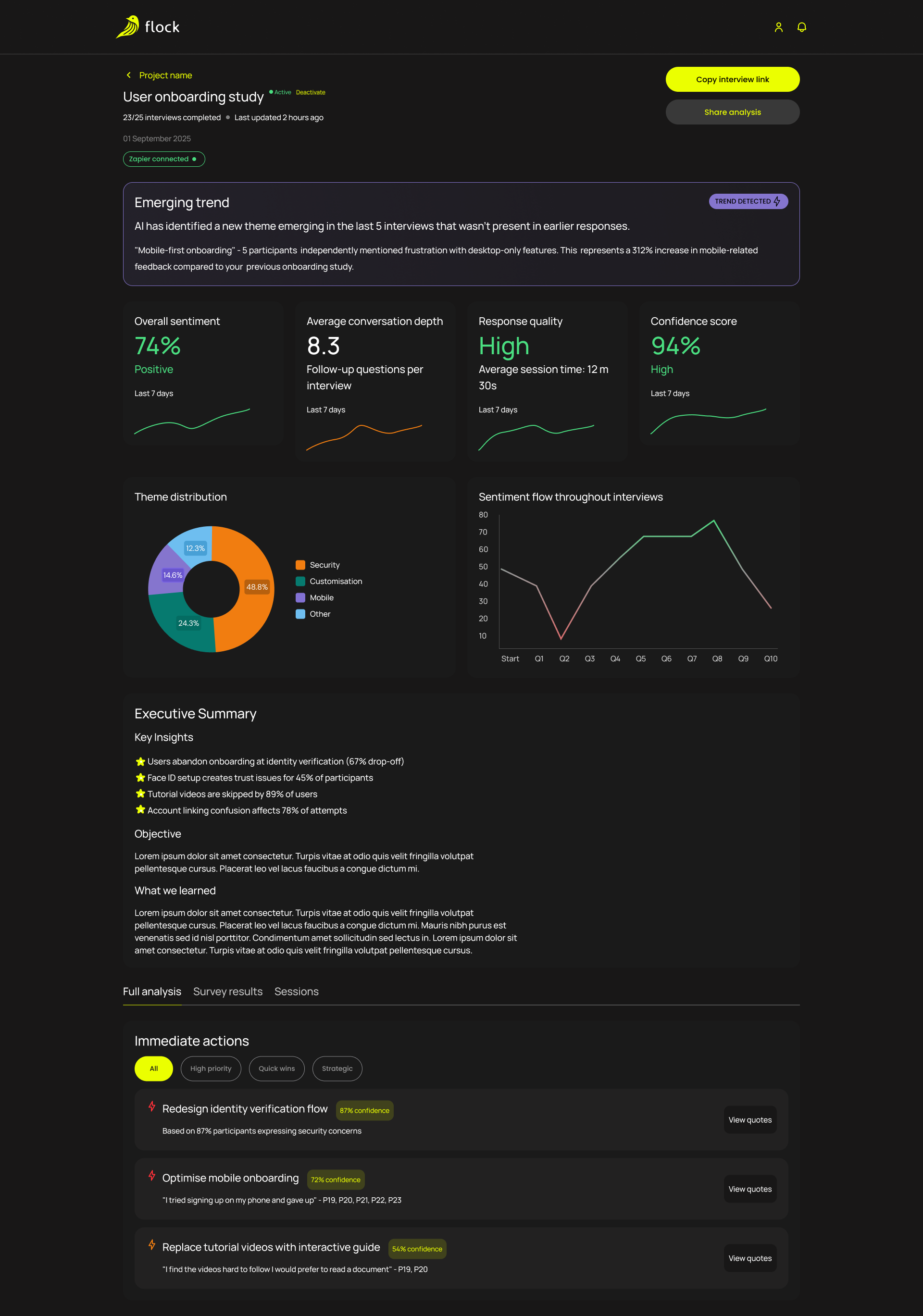 Conduct qualitative interviews instead. Get deeper insights at scale, faster than ever. Our platform bridges the gap between static surveys and time-intensive human interviews, giving you actionable insights in record time. Perfect for start-ups and small teams.