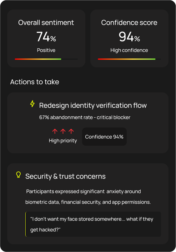 Struggling to make sense of user research data? Let our platform do the heavy lifting. With cutting-edge AI and a custom analysis tool, you’ll get clear, actionable insights. Focus on growing your business, not crunching data.